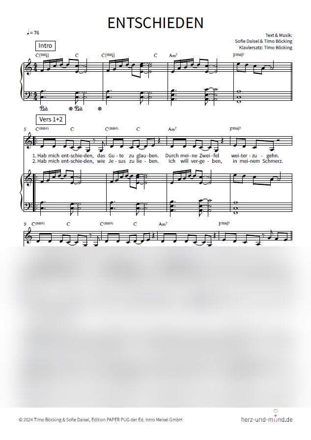 Hinweis: Sie erwerben mit dem Download das Recht, das Lied einmal für Ihren eigenen Gebrauch auszudrucken. Wenn Sie mehrere Notenausdrucke (z.B. für einen Chor) brauchen, appellieren wir an Ihre Fairness: Bitte kaufen Sie dann mehrere Ausdruckrechte. Bitte helfen Sie mit, dass Autoren und Verlag auch zukünftig Musik publizieren können. Herzlichen Dank.