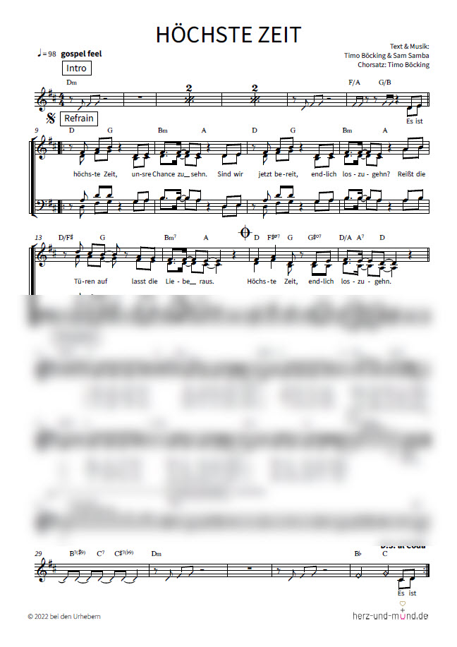 Hinweis: Sie erwerben mit dem Download das Recht, das Lied einmal für Ihren eigenen Gebrauch auszudrucken. Wenn Sie mehrere Notenausdrucke (z.B. für einen Chor) brauchen, appellieren wir an Ihre Fairness: Bitte kaufen Sie dann mehrere Ausdruckrechte. Bitte helfen Sie mit, dass Autoren und Verlag auch zukünftig Musik publizieren können. Herzlichen Dank.
